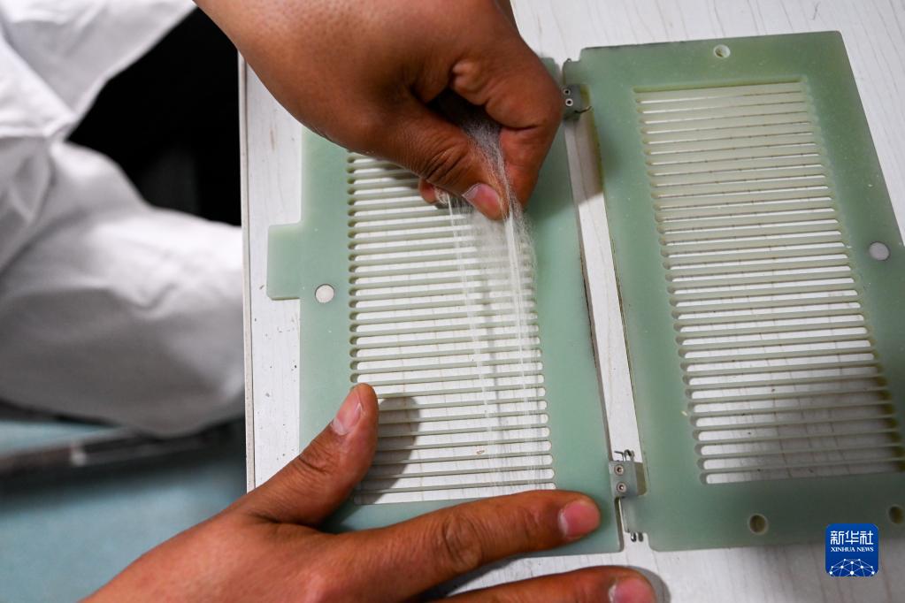 4月27日,在伊金霍洛旗蘇布爾嘎鎮敏蓋絨山羊研究中心,技術員在進行羊絨細度檢測。