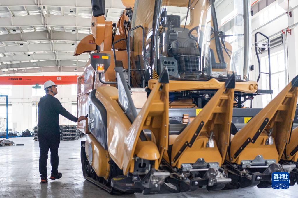 4月26日,宮照旭在公司生產車間內查看其自主研發生產的全地形履帶式玉米收割機。