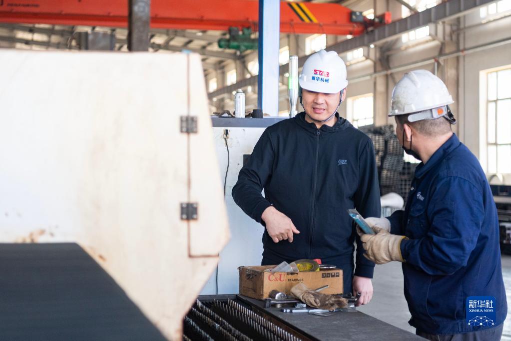 4月26日,宮照旭(左)在公司生產車間內和工人交流,了解生產有關情況。
