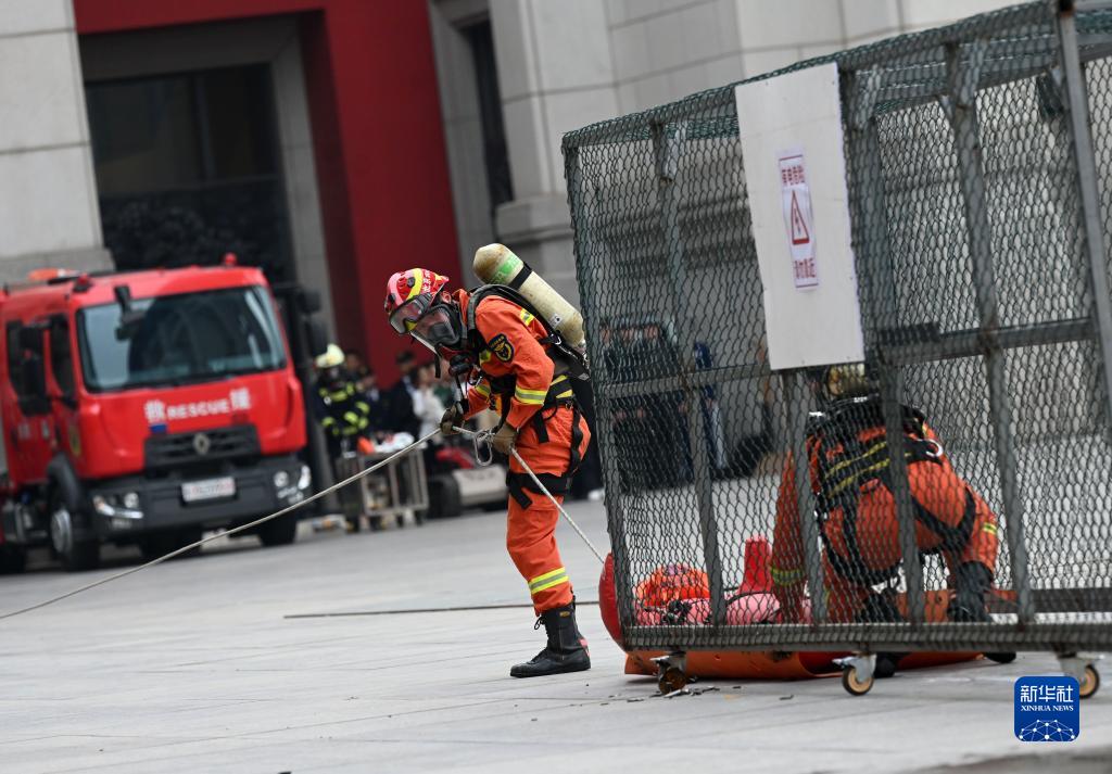 4月27日,消防隊員進行救援演練。