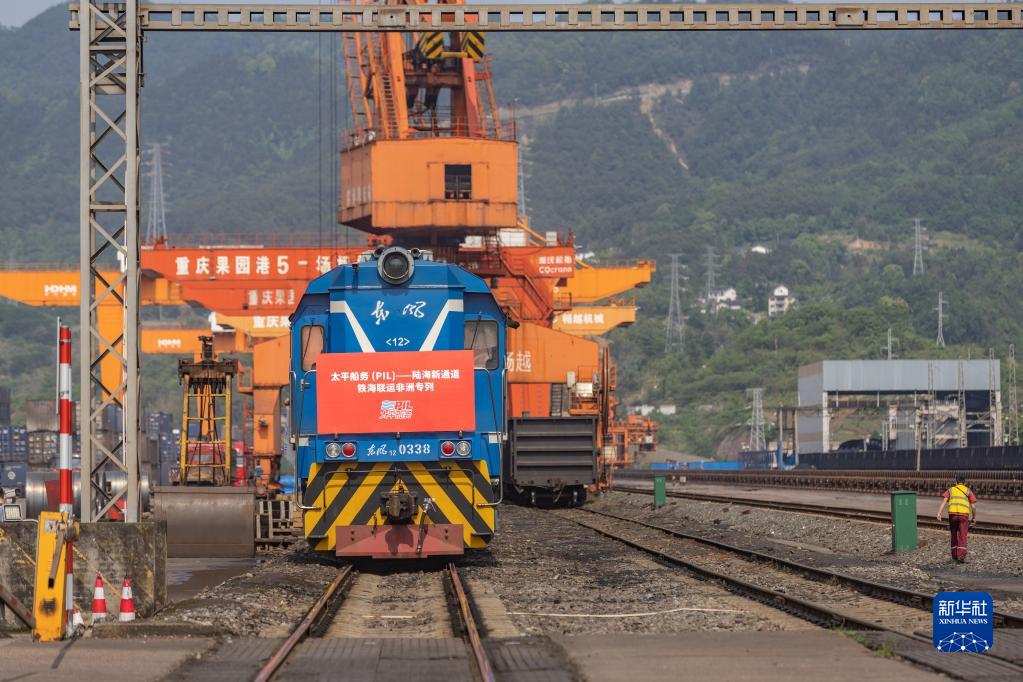 4月27日,太平船務——西部陸海新通道江鐵海聯運非洲專列在重慶果園港魚嘴站等待發車。