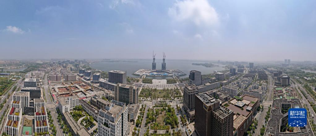 4月27日拍攝的臨港西島中銀金融中心項目建設工地(中)(無人機全景照片)。