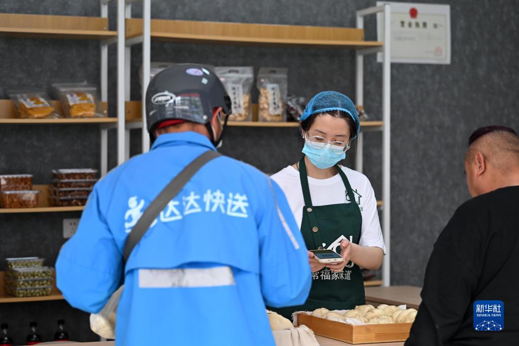 4月27日,快遞小哥在星火驛站購買食物。