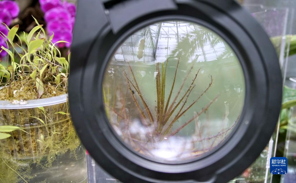 這是4月27日在國家植物園溫室內透過放大鏡拍攝的美杜莎捕蟲樹。