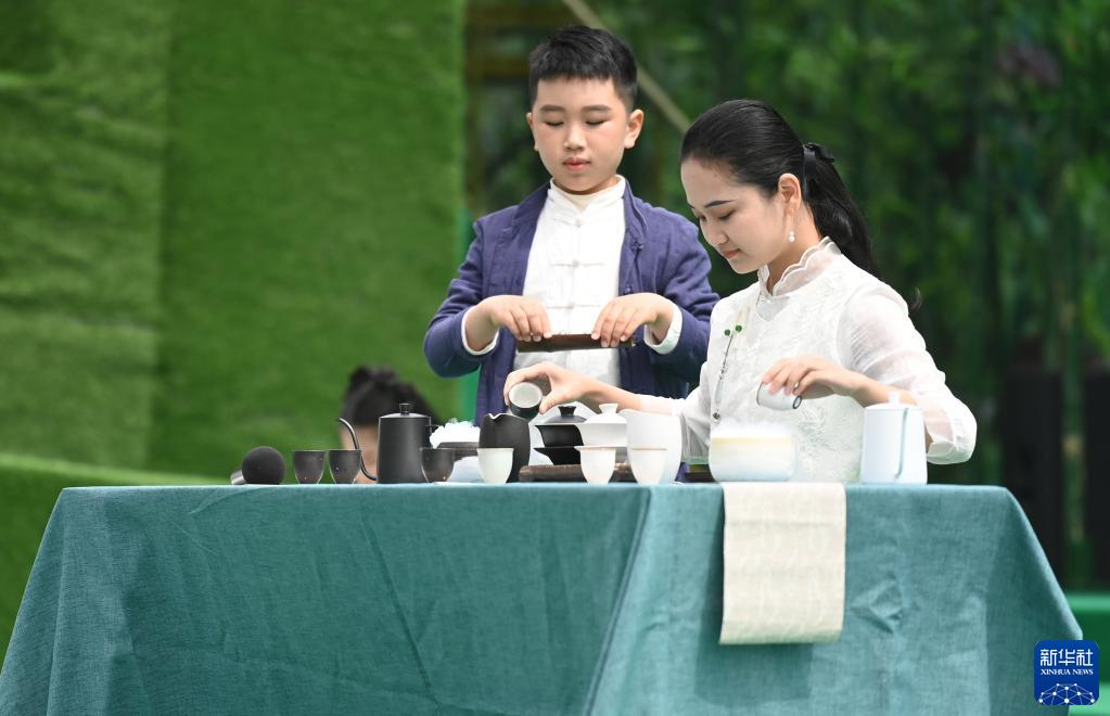 4月28日,柘榮縣第一小學茶藝社團的小茶藝師在開幕式上進行茶藝表演。