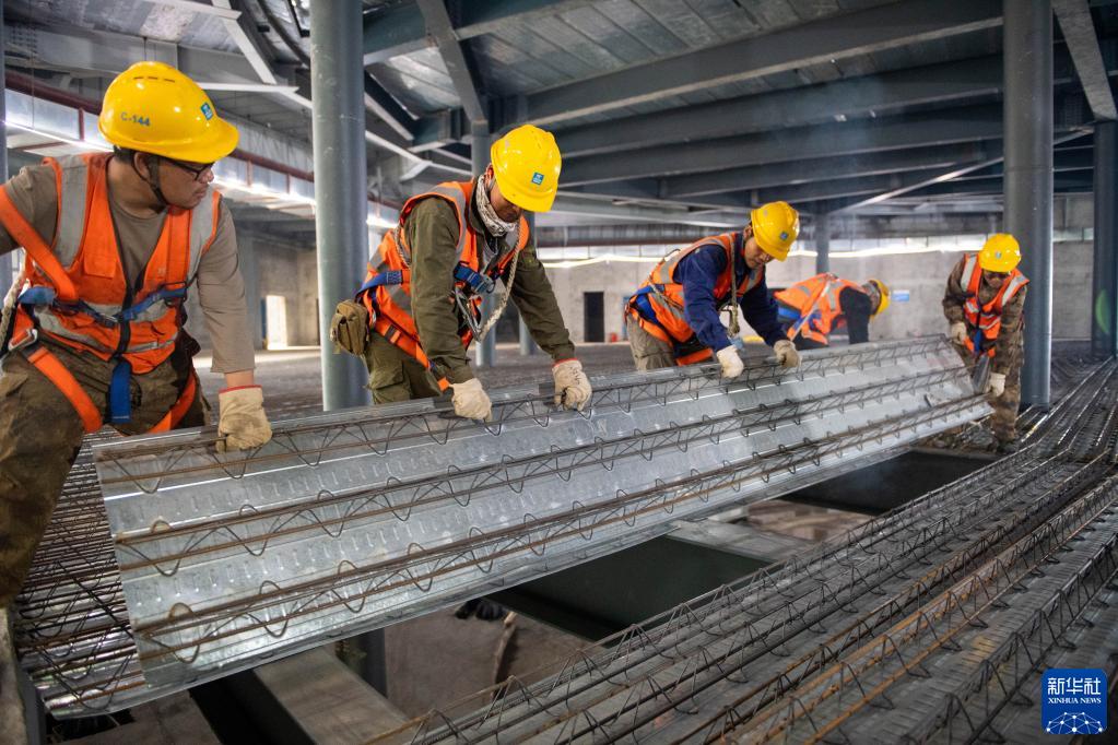 4月28日,在郴州市文體中心建設工地,中建五局裝飾公司工人在擺放最后一塊鋼結構桁架樓層板。