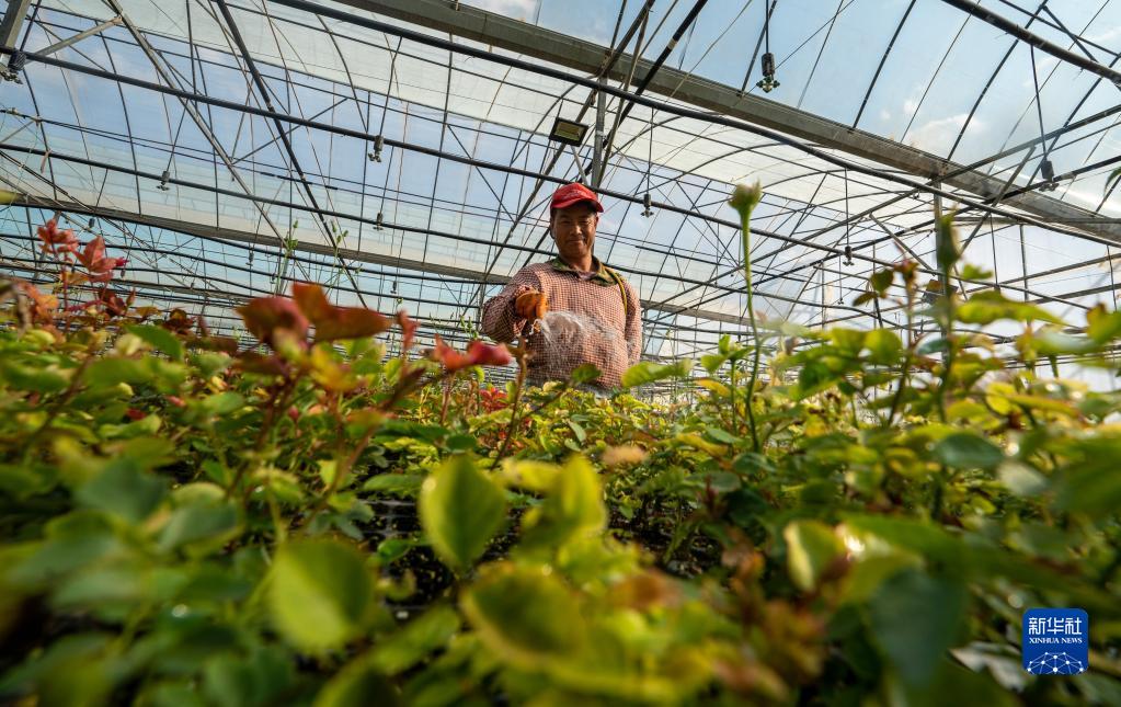 工人在云南錦科花卉工程研究中心給玫瑰種苗澆水(4月3日攝)。