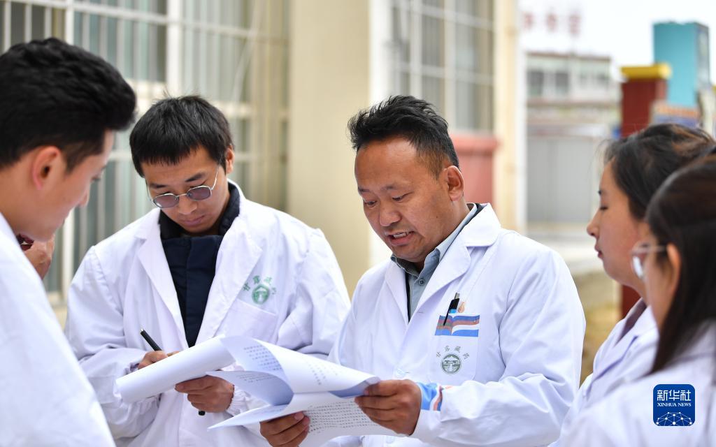 普窮次仁和學生們一起學習中醫藥相關政策(4月20日攝)。