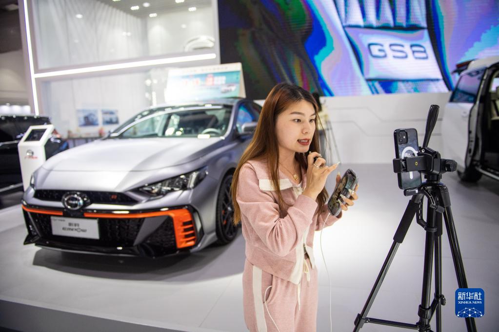 4月28日,一名主播通過直播介紹參展汽車。