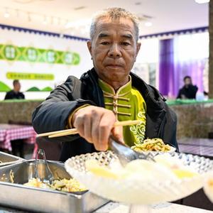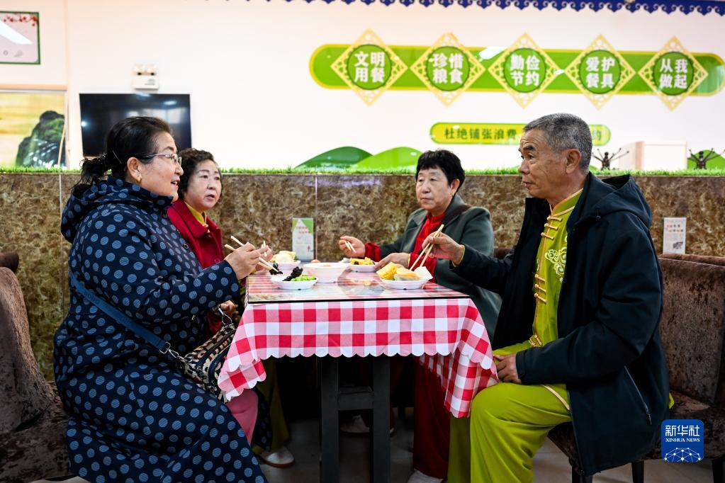 4月28日,老年人在伊金霍洛旗助餐點之一的福馨自助餐廳用餐。