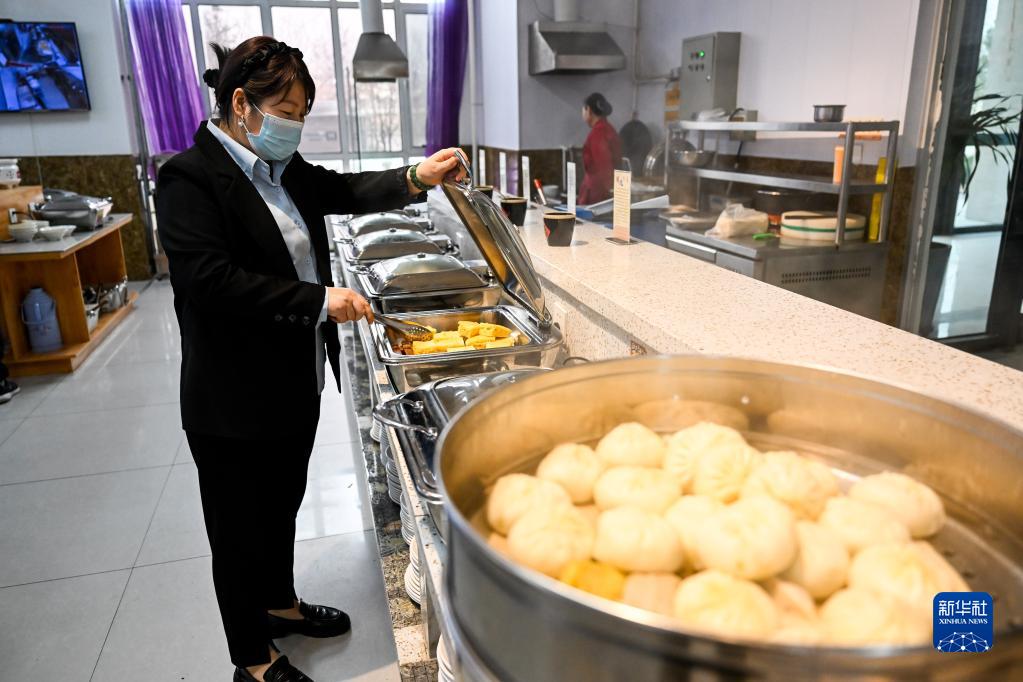 4月28日,在伊金霍洛旗助餐點之一的福馨自助餐廳,工作人員查看菜品情況。