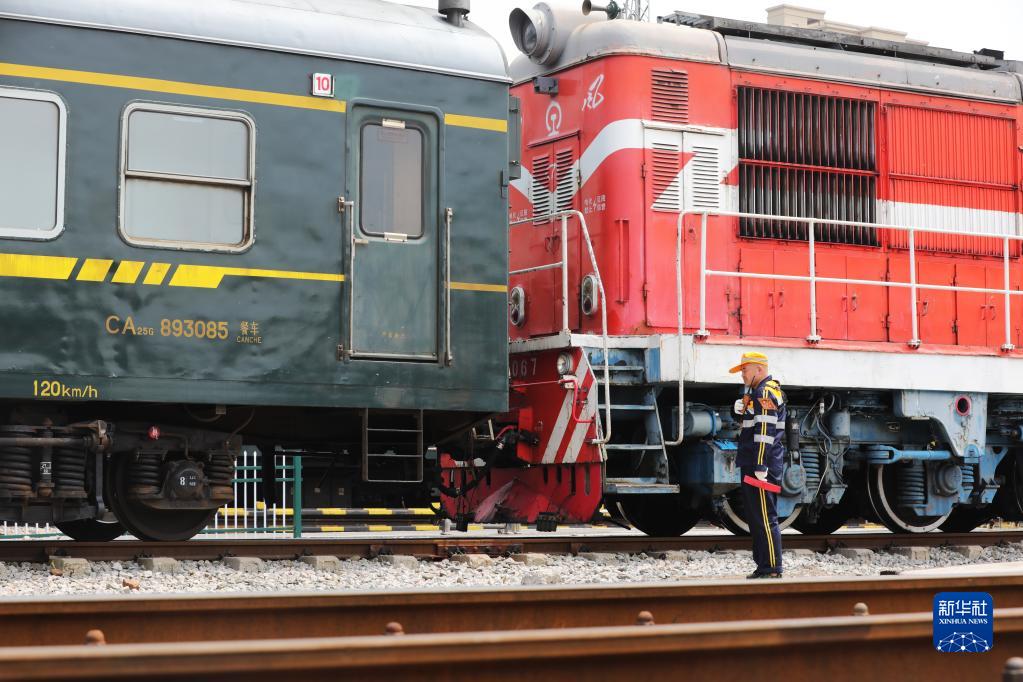 4月28日,中國鐵路上海局集團有限公司徐州站的鐵路連結員在進行單機連掛車輛作業。