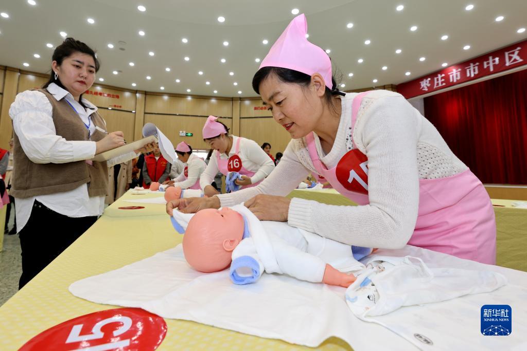 4月27日,在山東省棗莊市市中區總工會,月嫂進行新生兒護理技能比賽。