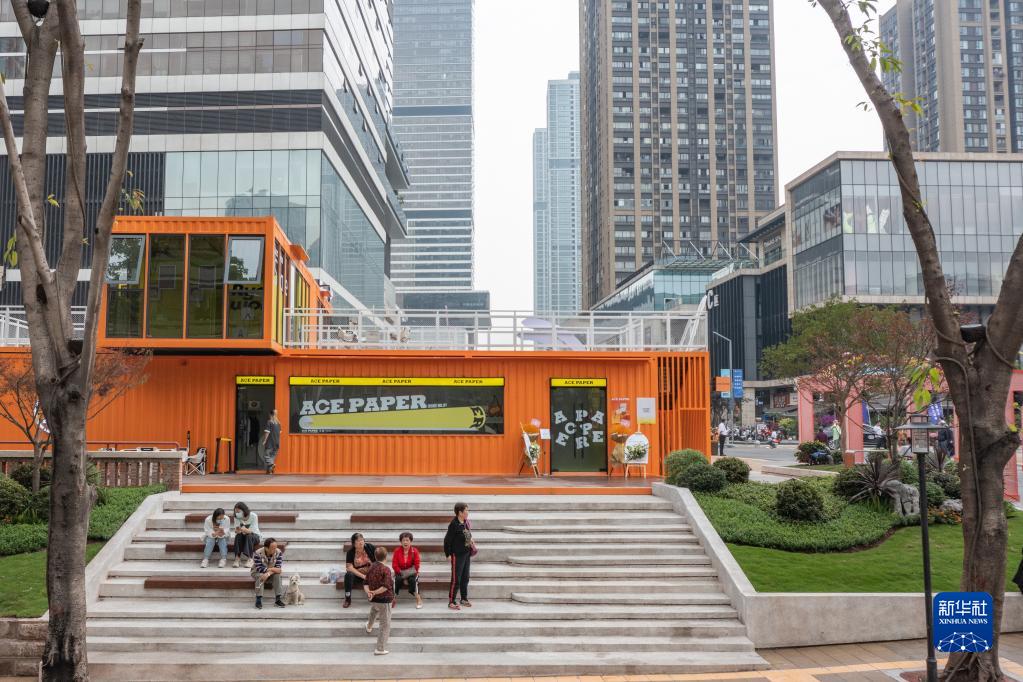 4月28日,在竣工亮相的重慶市九龍坡區謝家灣街道民主村片區城市更新項目(一期),人們在一處公共空間休息(無人機照片)。