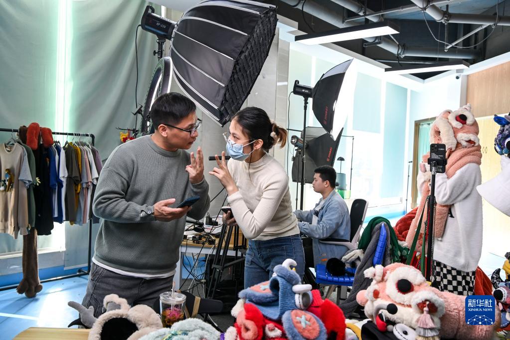 何繼良(左)在廣西桂林的工作室與直播銷售團隊的工作人員交流(1月10日攝)。