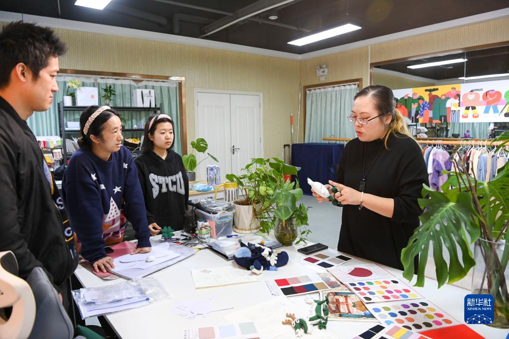 4月25日,劉思蔚(右)在位于廣西桂林的工作室與樣品生產團隊的工作人員交流。