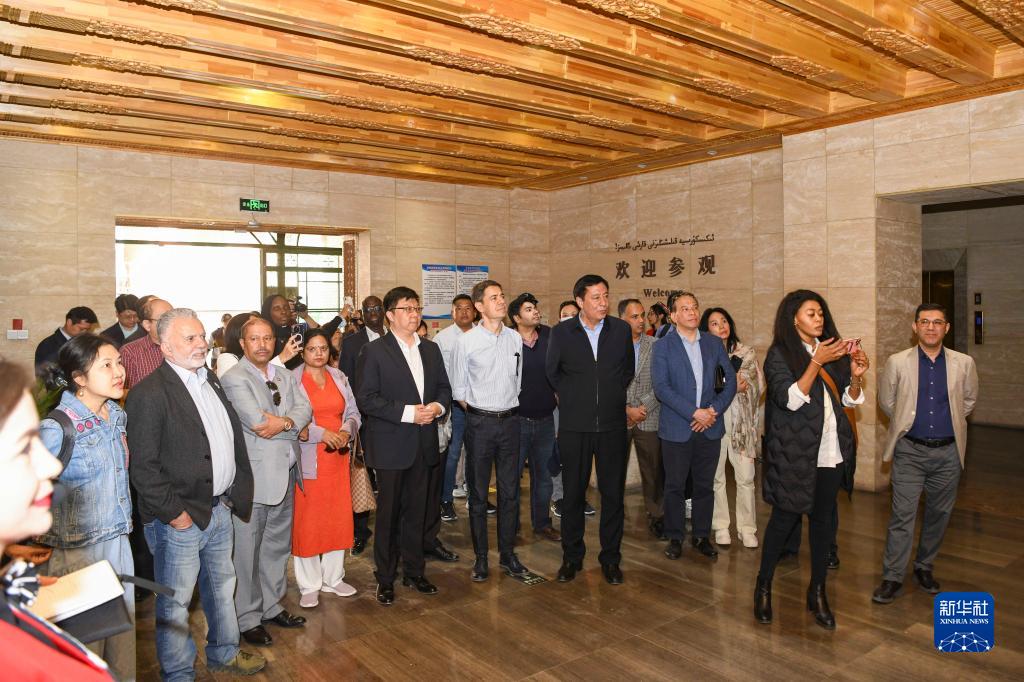 巴西、伊朗、印度尼西亞、巴基斯坦、厄瓜多爾和塞內加爾等14國駐華總領事參觀新疆喀什市老城區保護綜合治理紀念館(4月24日攝)。新華社記者 胡虎虎 攝