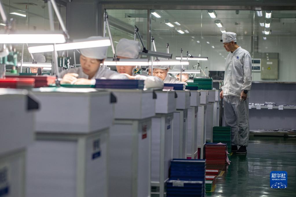 4月25日,在位于深圳的飛亞達鐘表大廈,劉中華(右)在手表裝配線上對工人進行技術指導。新華社記者 毛思倩 攝