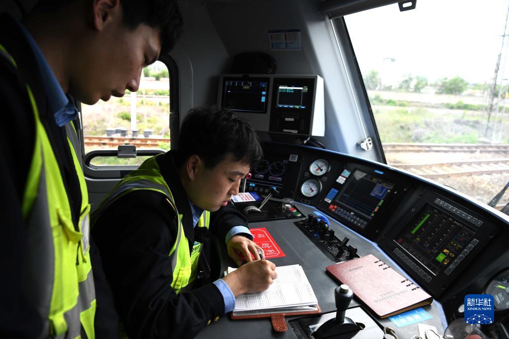 4月28日,尚志雄(右)和副司機田錦波在值乘的中歐班列機車上做信息登記。新華社記者 金劍 攝