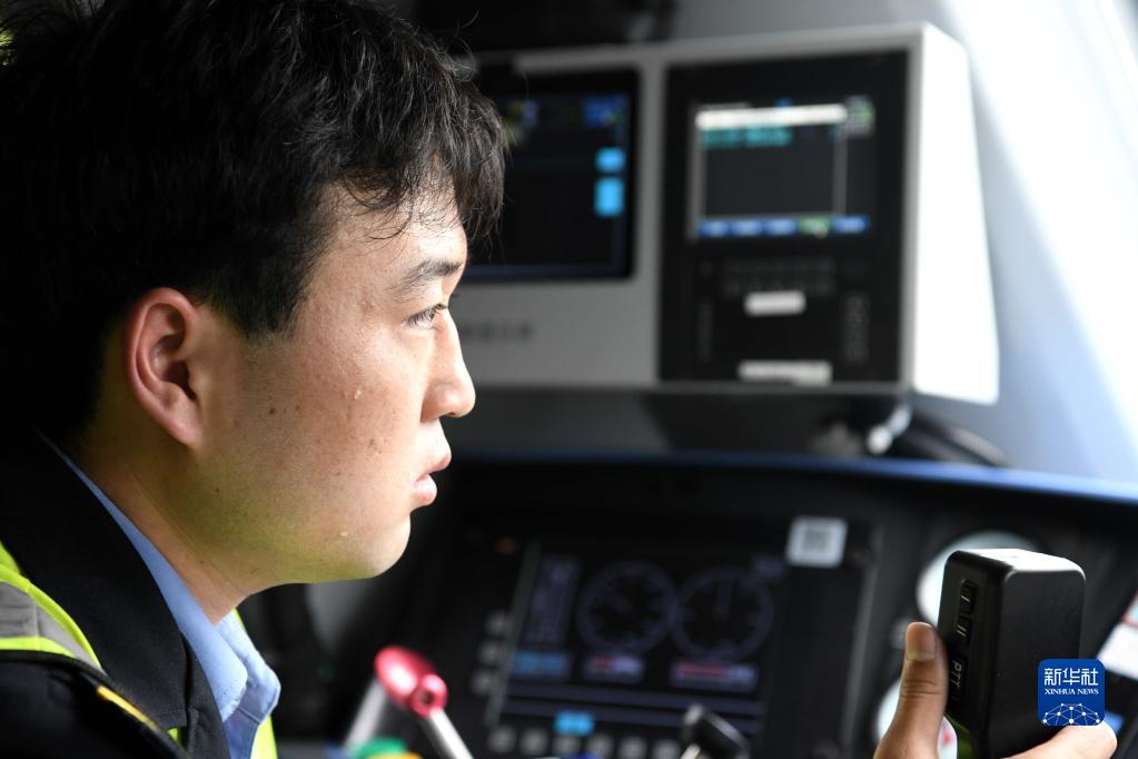 4月28日,尚志雄在值乘的中歐班列機車上。新華社記者 劉軍喜 攝