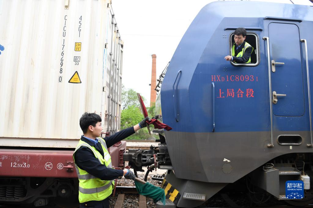 4月28日,副司機田錦波(左)在合肥東站指揮機車與中歐班列列車對接。新華社記者 劉軍喜 攝