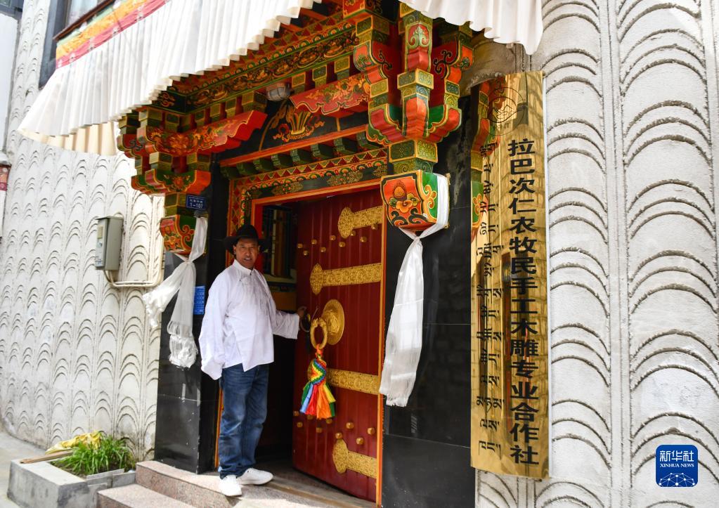 拉巴次仁在農牧民手工木雕專業合作社門前(4月25日攝)。