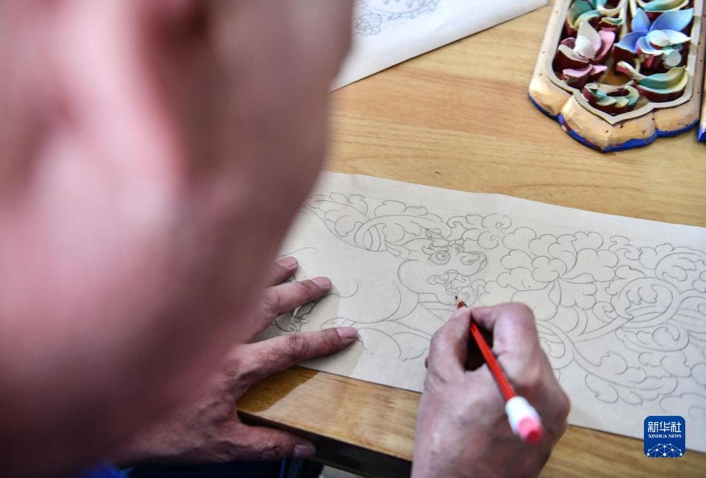 拉巴次仁在繪制木雕模板草圖(4月25日攝)。