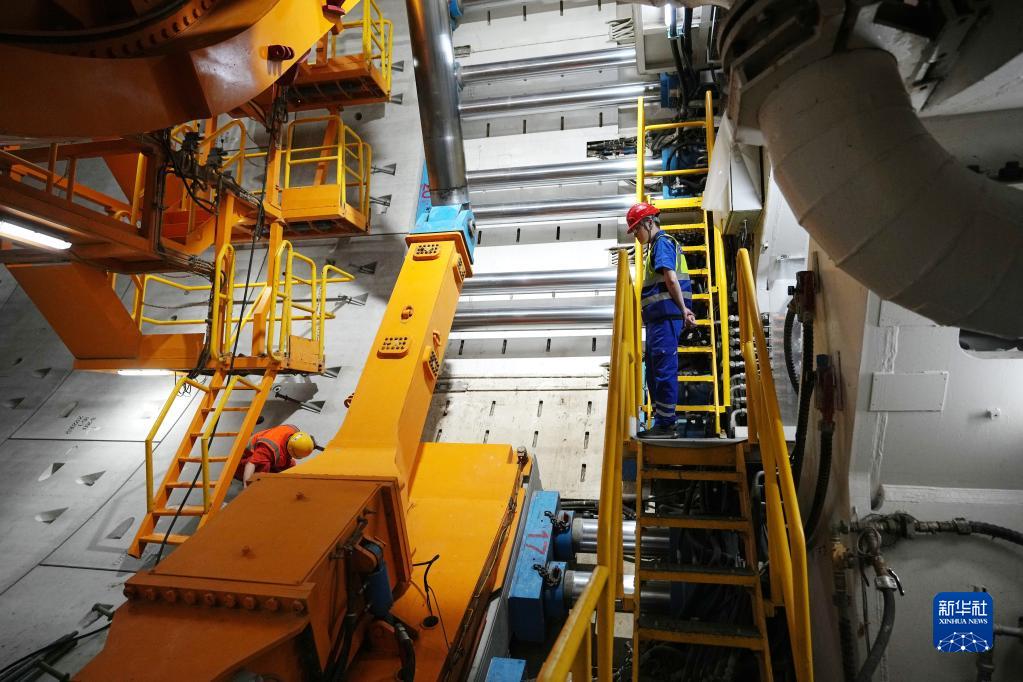 在盾構機推進一環結束后的管片拼裝期間,黃魯(右)在旁站管片拼裝(4月19日攝)。