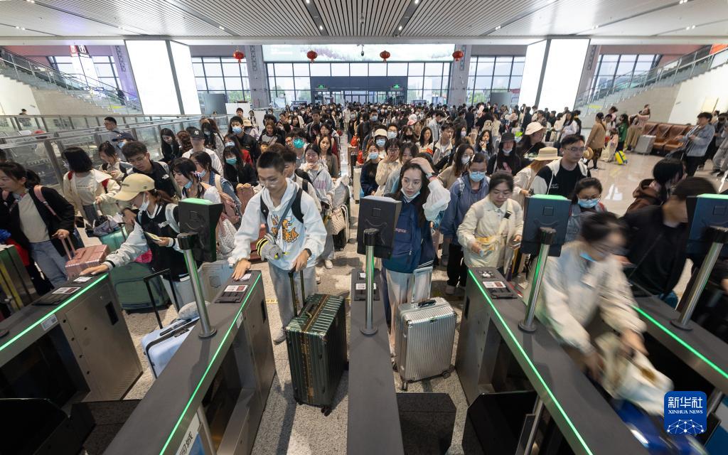 4月29日,在浙江省湖州市,旅客在火車站候車大廳依次檢票。