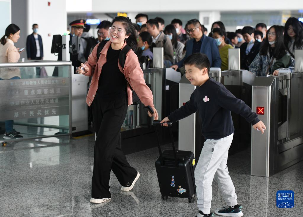 4月29日,旅客在安徽阜陽西站通過閘機檢票準備乘車。