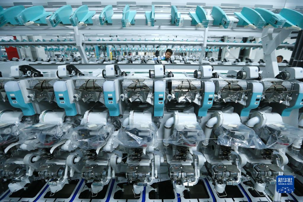 4月29日,技術工人在山東省青島市即墨區即發龍山工業園的一處數字化智能紡紗工廠安裝生產設備。