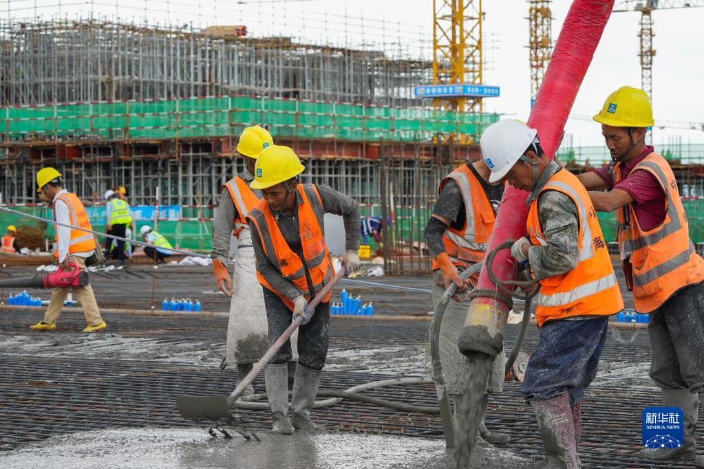 4月29日,中建三局參建人員在廣州白云國際機場三期擴建工程T3航站樓項目現場澆筑混凝土。