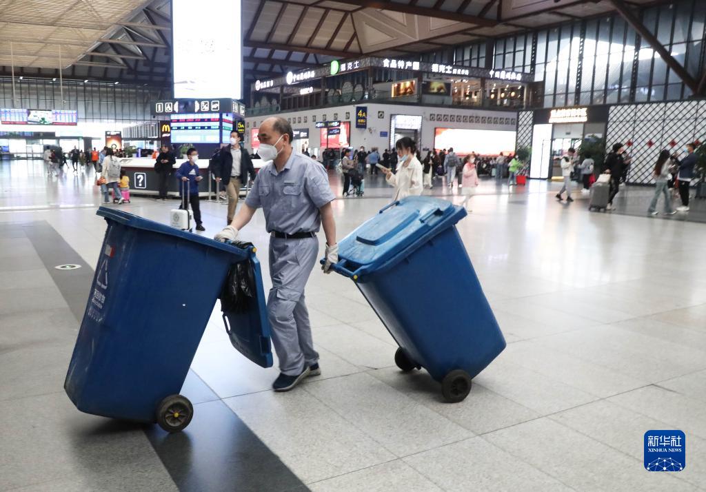 4月29日,在江蘇蘇州站候車大廳,一名保潔員在忙碌。