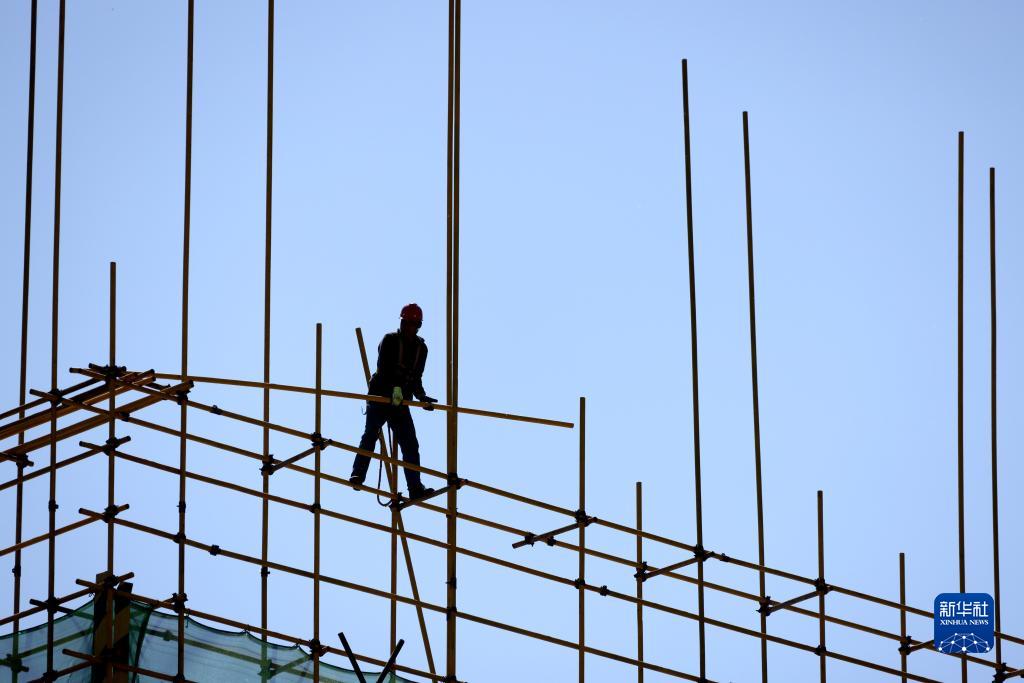 4月29日,建筑工人在山東省棗莊市一處建設工地施工。