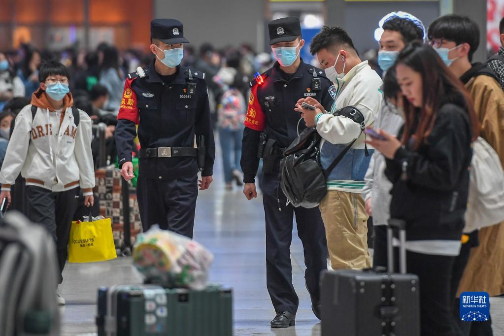 4月29日,長春鐵路公安處民警在長春站候車大廳執勤。