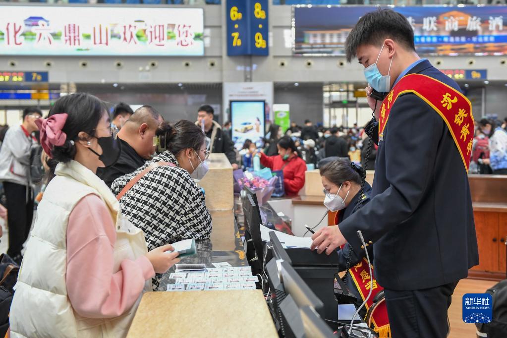 4月29日,長春站候車大廳的工作人員解答旅客問詢。