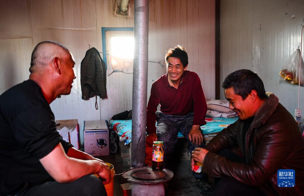 干完活回到臨時板房后,治沙客劉金成(中)與工友聊天(4月25日攝)。