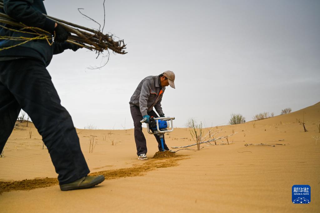 治沙客在內蒙古庫布其沙漠億利生態治理區種植苗木(4月27日攝)。