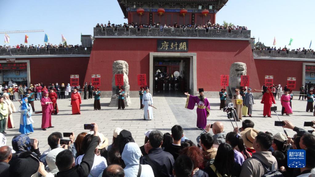 4月29日,眾多游客在河南省開封市開封府景區門前觀看《包公迎賓》儀式。