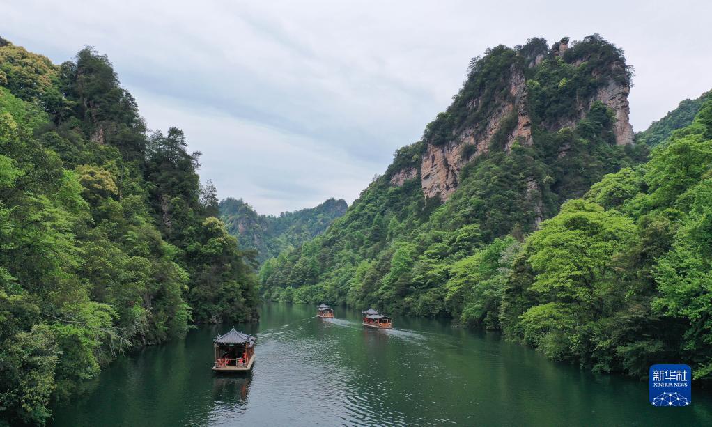 4月29日,游客在湖南張家界寶峰湖景區乘船游覽(無人機照片)。
