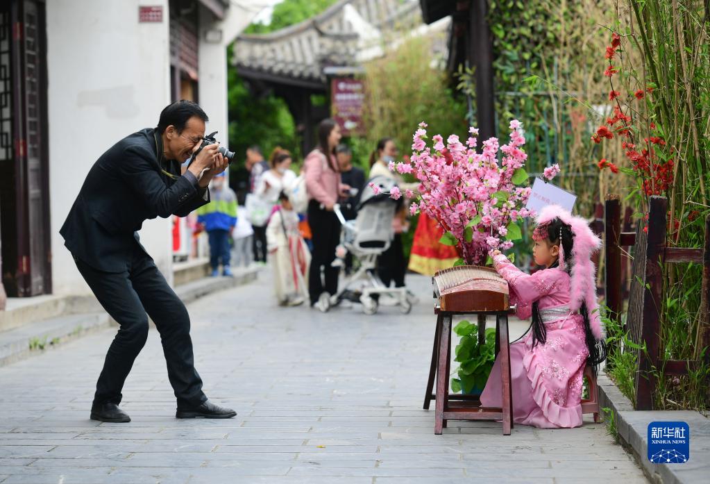 4月29日,在安徽省合肥市肥西縣三河古鎮景區,一名小朋友身著古裝拍照。