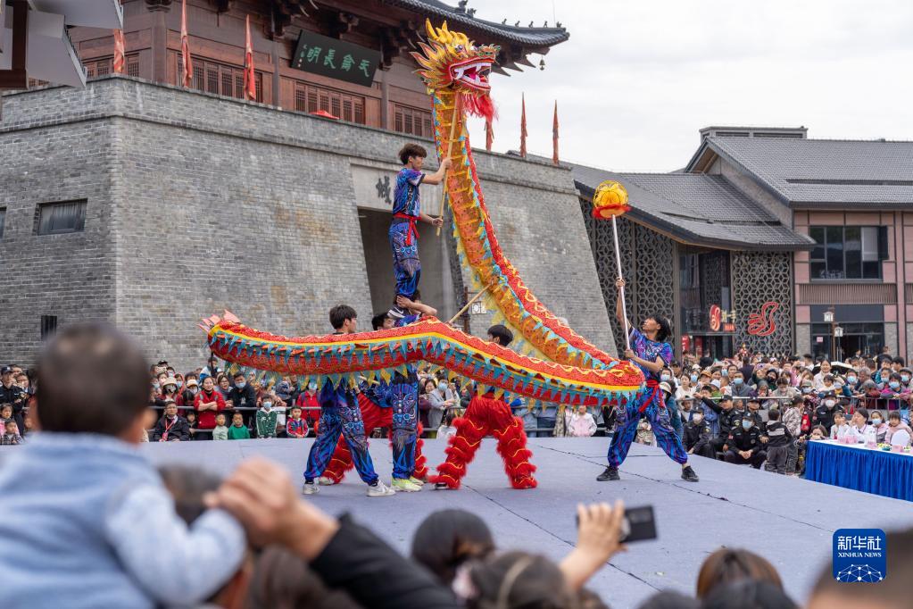 4月29日,游客在安徽省合肥市肥東縣國風特色文化街區欣賞舞龍表演。