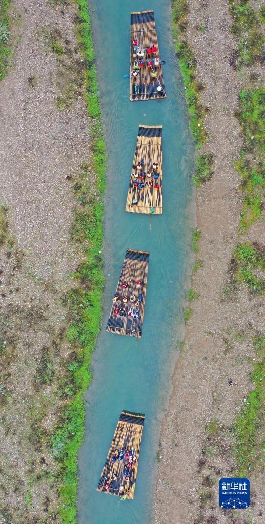 4月29日,游客在浙江省臺州市仙居縣永安溪體驗生態竹筏漂流(無人機照片)。