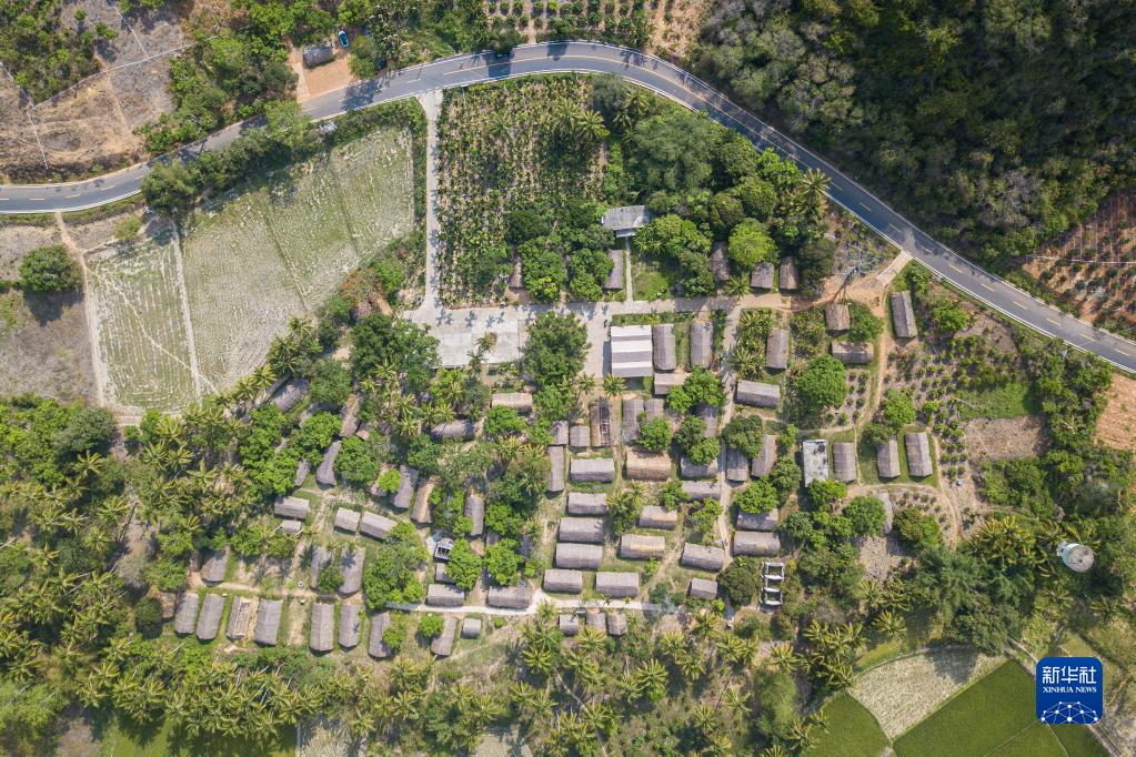 4月28日在海南省東方市白查村拍攝的黎族船型屋及近年修建的道路(無人機照片)。