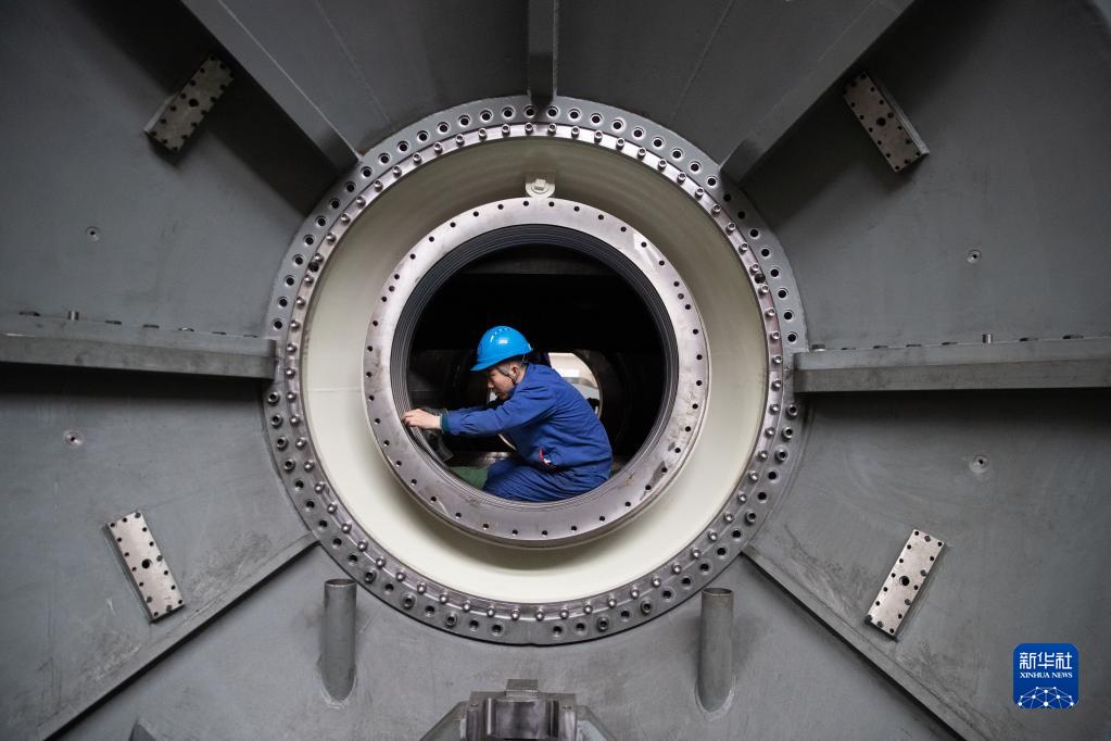 4月28日,工作人員在哈電集團哈爾濱汽輪機廠有限責任公司車間內測量設備尺寸。