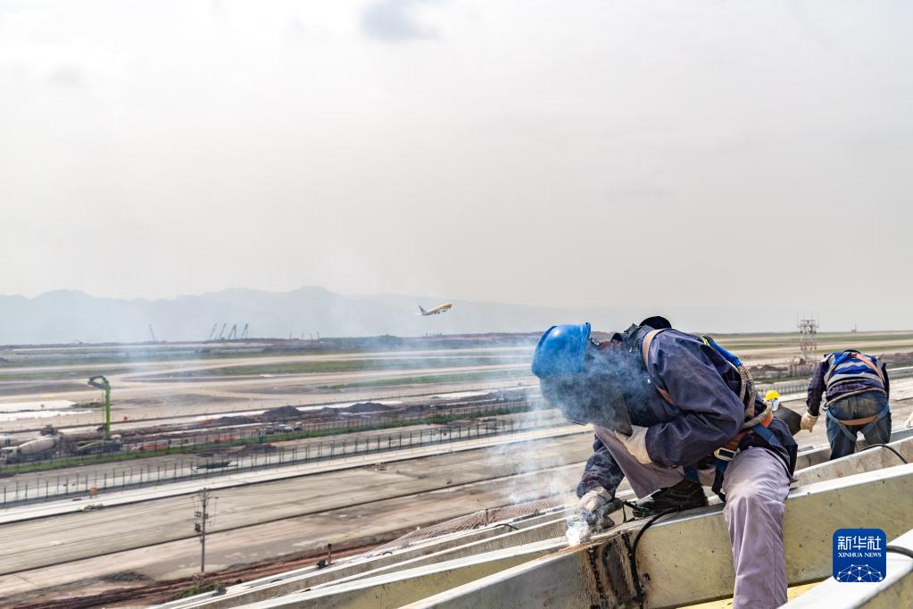 4月29日,工作人員在重慶江北國際機場T3B航站樓施工現場進行焊接作業。