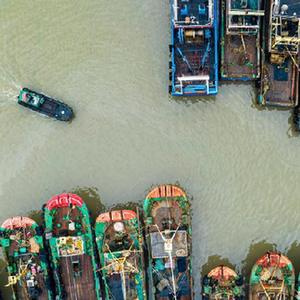 4月29日,漁民乘坐擺渡船準備上岸(無人機照片)。