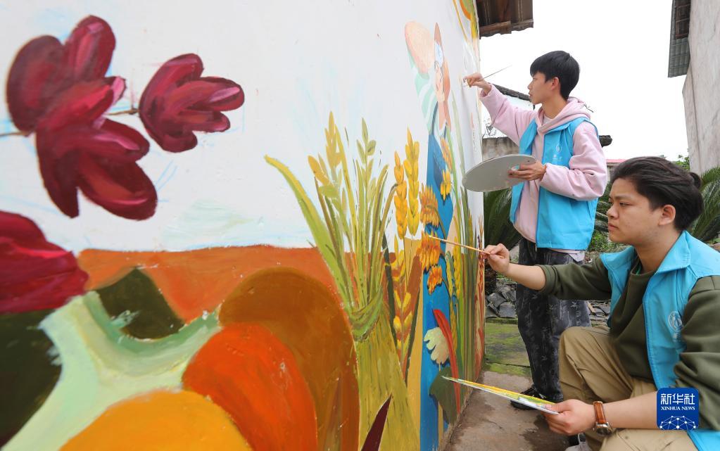 4月29日,在衡陽縣西渡鎮新橋村,南華大學的大學生志愿者在繪墻畫。