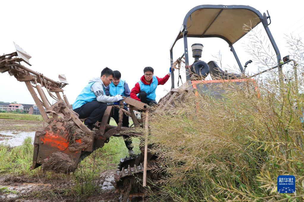 4月29日,在衡陽縣西渡鎮新橋村,南華大學的大學生志愿者在檢修農機。