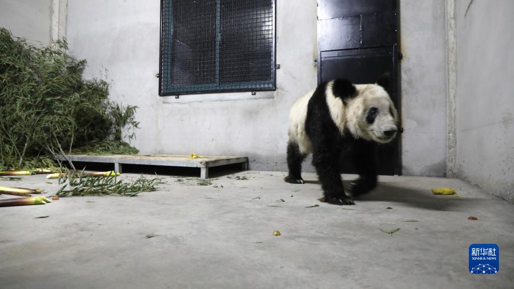 北京時間4月27日16時26分,23歲的旅美歸國大熊貓“丫丫”抵達上海浦東國際機場,在中方獸醫和工作人員的陪護下,前往封閉隔離檢疫區。這是4月27日在上海的隔離檢疫圈舍內拍攝的“丫丫”。